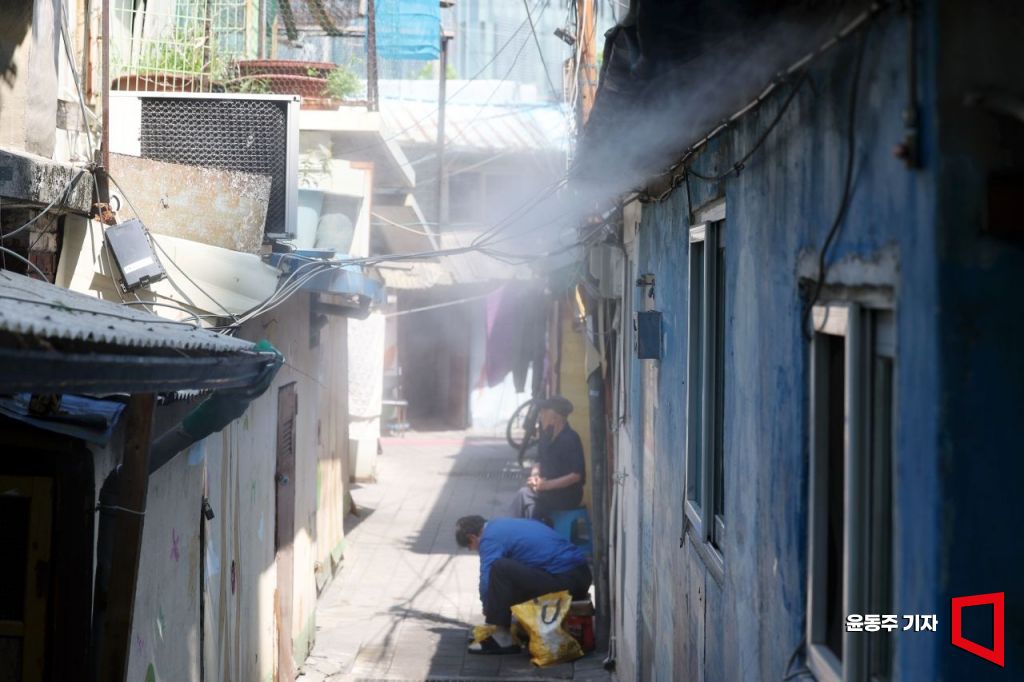23일 서울 영등포구 쪽방촌 거주민이 쿨링포그로 더위를 식히고 있다.