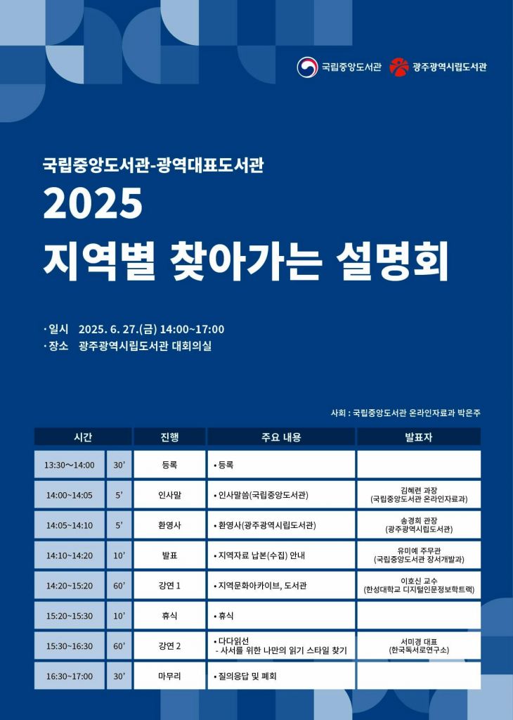 국립중앙도서관은 오는 27일 오후 2시 광주광역시립도서관에서 광주·전남·전북 지역 공공도서관과 유관기관을 대상으로 지역자료 수집 활성화를 위한 '2025 지역별 찾아가는 설명회'를 개최한다고 23일 밝혔다.