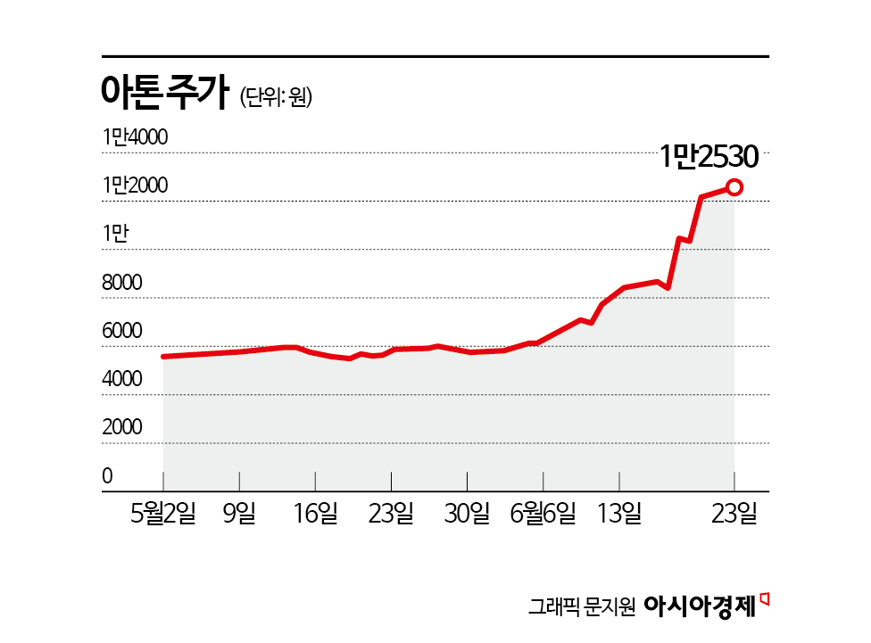 24일 금융투자업계에 따르면 아톤 주가는 이달 들어 119.1% 올랐다. 같은 기간 코스닥 지수 상승률은 6.9%다. 외국인과 기관 투자가가 각각 55억원, 53억원 누적 순매수를 기록하면서 주가 상승을 이끌었다. 외국인은 주당 평균 7780원에 매수해 평가수익률 61%를 기록했다.