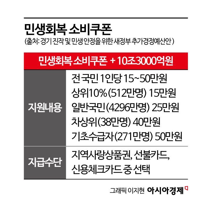 정부는 이르면 내달부터 1인당 최대 52만원의 '민생회복 소비쿠폰'을 지급할 예정이다. 전 국민 5117만명을 대상으로 진행하며 구체적으로 ▲소득 상위 10% 15만원 ▲일반 국민 25만원 ▲차상위층 40만원 ▲기초생활보장 수급자 50만원이 지원된다. 84개 농어촌 인구소멸지역민에게는 1인당 2만원이 추가 지급된다. 쿠폰은 지역사랑상품권, 선불카드, 신용·체크카드 중에서 선택할 수 있다.