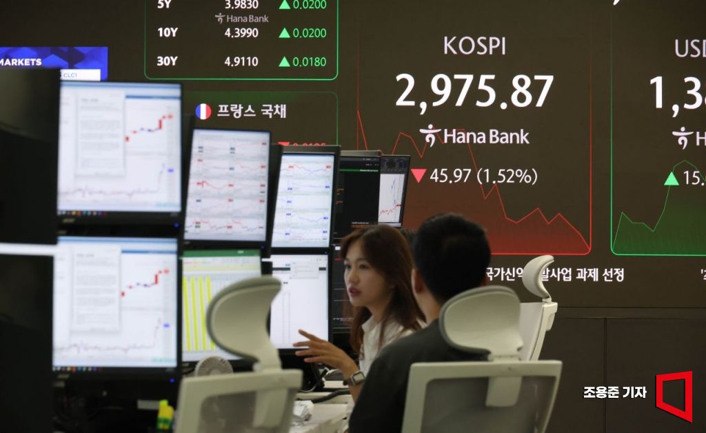 미국의 이란 공습에 따라 중동리스크가 커지고 있는 가운데 코스피 지수가 장중 3000선이 무너진 23일 서울 중구 하나은행 딜링룸 현황판에 코스피지수와 원/달러 환율이 표시되고 있다. 이날 코스피 지수는 전 거래일 대비 0.98% 내린 2,992. 83포인트(0.24%) 장을 시작했다. 2025.6.23 조용준 기자