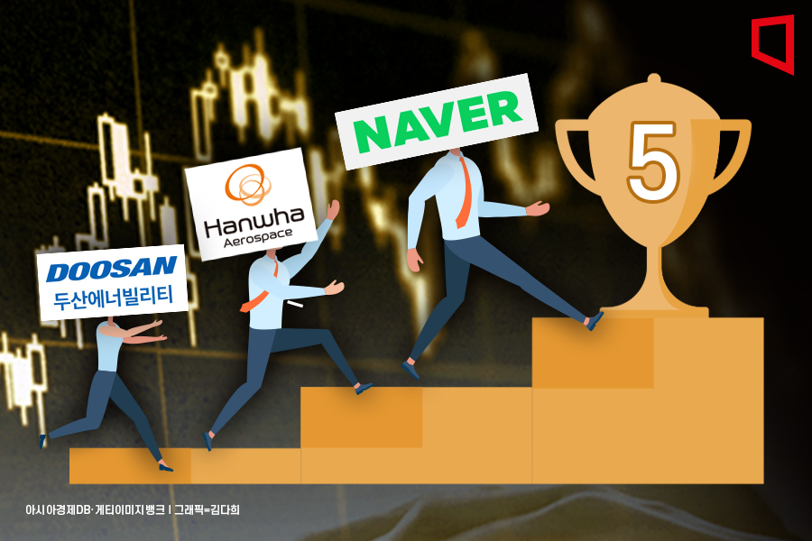 코스피 시가총액 순위에 또 한 번 지각변동이 일어났다. '차기 황제주' 한화에어로스페이스가 지난달 현대차를 제치고 시총 5위에 등극한 데 이어 이번엔 '인공지능(AI) 대장주' 네이버가 그 자리를 꿰찼다. 여기에 '원전 기대주' 두산에너빌리티까지 참전하면서 시총 5위를 둘러싼 경쟁은 더 치열해질 전망이다.