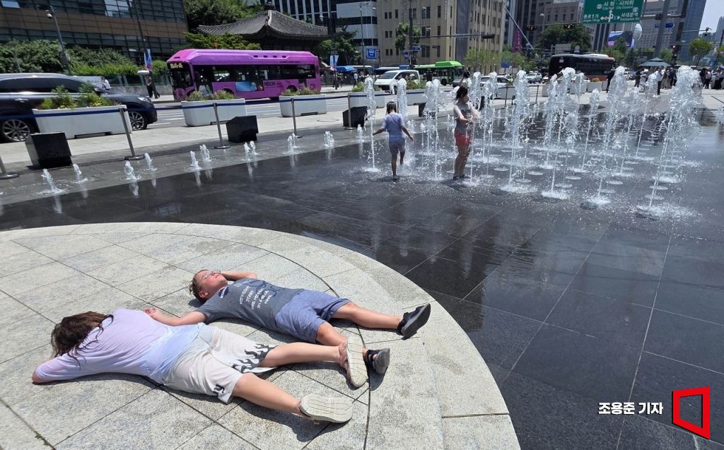 낮 최고기온이 33도를 웃돌고 후텁지근한 날씨가 이어진 지난 19일 서울 종로구 광화문광장 분수대를 찾은 아이들이 물놀이를 즐기고 있다. 조용준 기자