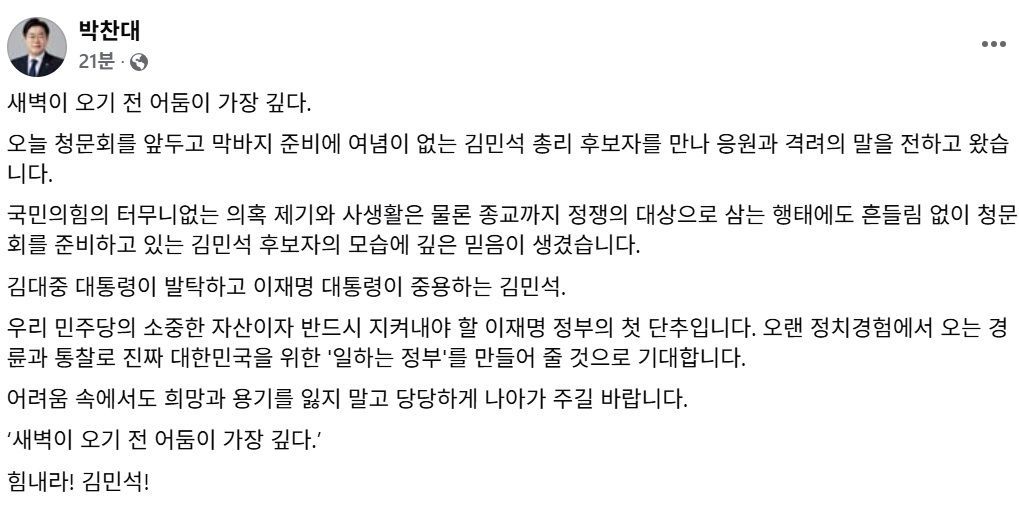 박 의원은 김 후보자를 향해 "새벽이 오기 전 어둠이 가장 깊다"며 "힘내라! 김민석!"이라고 했다.