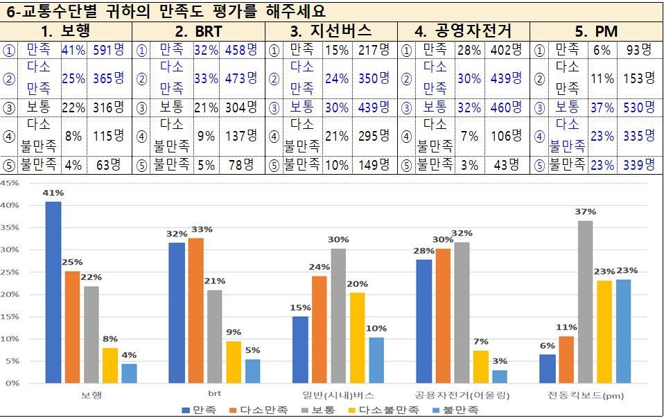 조사 결과 교통수단별 만족도는 보행 65%, 공용자전거 58%, BRT 55% 등으로 응답자 절반 이상이 긍정적으로 평가했지만, 지선버스(39%)와 개인형 이동 수단(17%)은 각각 배차 간격·노선 불만과 주차·안전 문제로 비교적 낮은 만족도를 나타냈다. 응답자 78%가 출·퇴근 시 40분 이내의 시간을 소요했고, 60분 이상을 소요하는 답변은 7%에 불과했다.