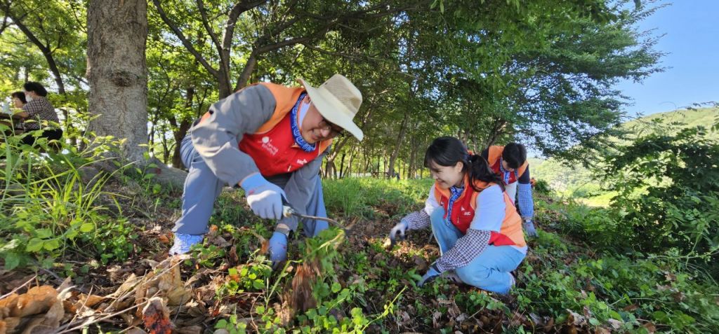 최두환 SK피아이씨글로벌 대표(왼쪽)가 구성원들과 함께 외래 식물 제거 활동을 하고 있다. SKC 제공