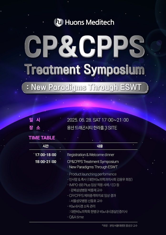 휴온스메디텍은 비뇨기 체외충격파 치료기 시술 사례 중심의 학술행사인 '만성전립선염&만성골반통증증후군 치료 심포지엄'(CP&CPPS Treatment Symposium)을 오는 28일 서울 용산구 서울드래곤시티에서 개최한다고 24일 밝혔다.