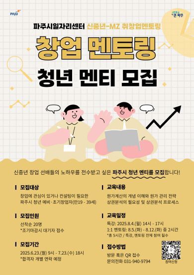 경기 파주시는 24일부터 7월 23일까지 '신중년-엠지(MZ) 멘토링 2기'에 참여할 청년을 모집한다고 밝혔다.