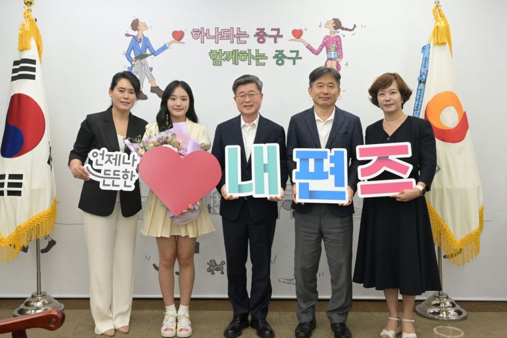 홍보대사에 위촉된 김태연(왼쪽 두번째)양과 김길성 중구청장(가운데). 중구 제공.