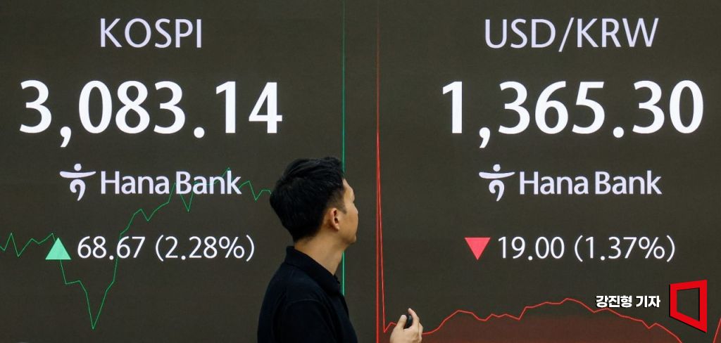 코스피가 중동 긴장 완화 영향에 2% 넘게 급등하며 3070선을 돌파한 24일 서울 중구 하나은행 본점 딜링룸에서 딜러들이 업무를 보고 있다.