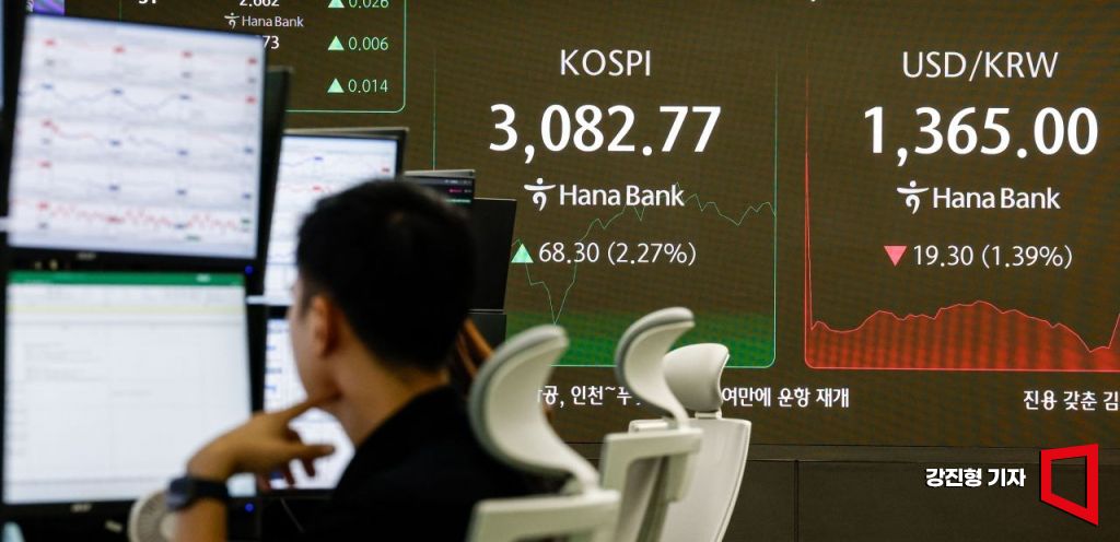 코스피가 중동 긴장 완화 영향에 2% 넘게 급등하며 3070선을 돌파한 24일 서울 중구 하나은행 본점 딜링룸에서 딜러들이 업무를 보고 있다.
