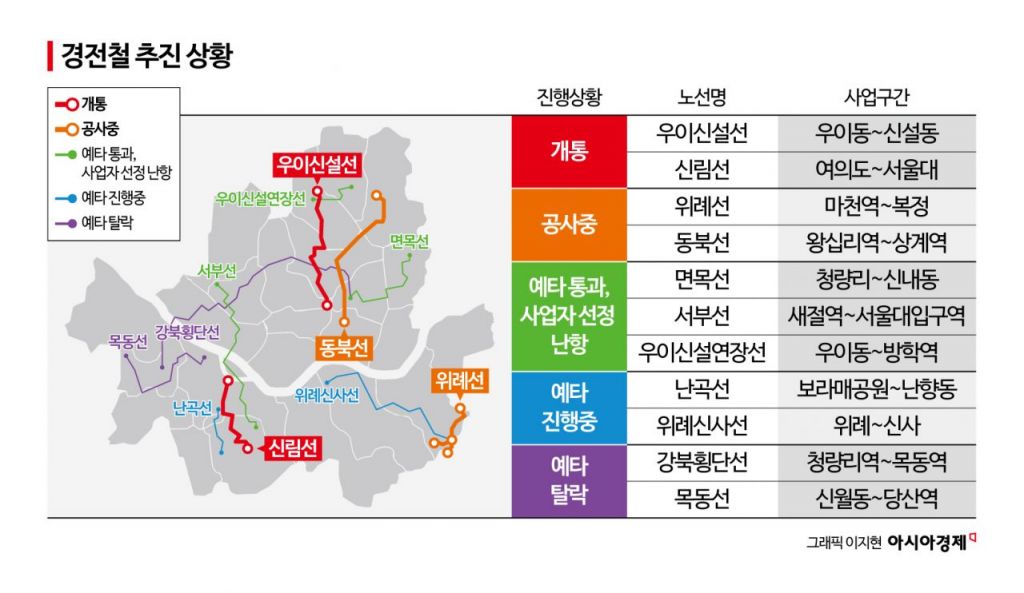 이 중 강북횡단선과 목동선은 지난해 기획재정부의 예비타당성 조사 문턱을 못 넘어 탈락했다. 난곡선은 예타 절차가 진행 중이지만 수익성 미달로 통과 가능성이 낮다는 관측이 나온다. 면목선은 예타 문턱을 넘었지만 사업자를 구하지 못해 사업이 앞으로 나가지 못하고 있다.