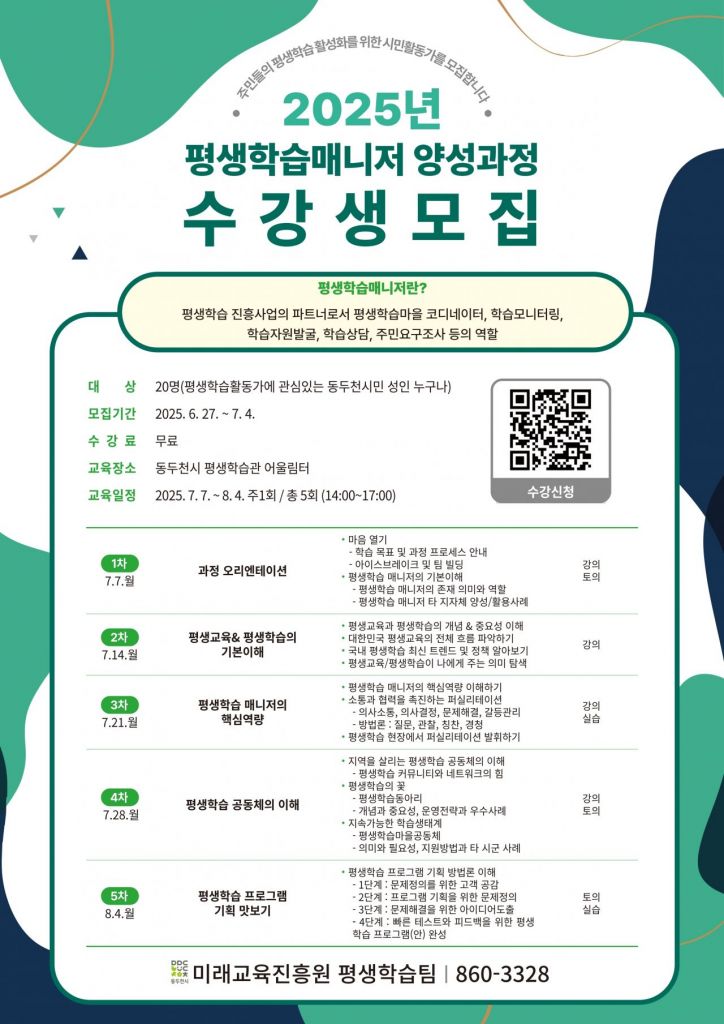 경기 동두천시 미래교육진흥원은 오는 27일부터 7월 4일까지 '2025년 평생학습 매니저 양성과정' 수강생을 모집한다고 24일 밝혔다.