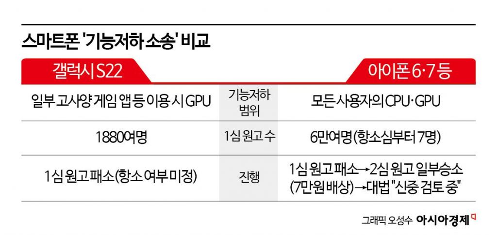 갤럭시S22 이용자들이 게임최적화서비스(GOS) 성능 저하 논란과 관련해 삼성전자에 집단소송을 냈다가 1심에서 패소하면서, 애플의 일부 배상책임을 인정한 '아이폰 성능 저하' 2심 판결과의 차이가 주목받고 있다.