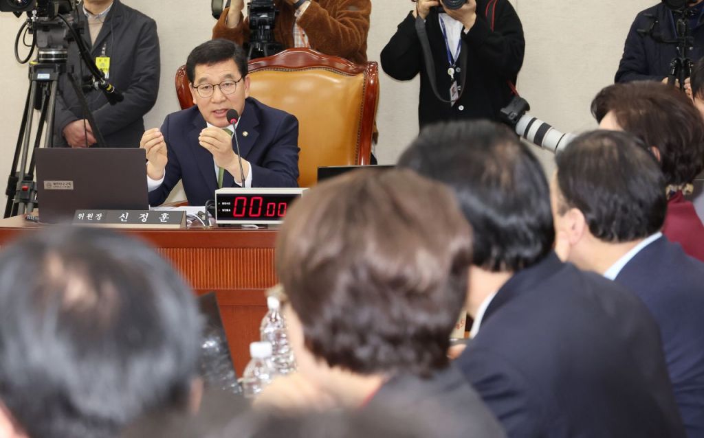 더불어민주당 소속 신정훈 위원장이 지난 3월 6일 서울 여의도 국회 행정안전위원회에서 열린 김대웅 중앙선거관리위원회 위원 후보자에 대한 인사청문회에서 여당 의원들의 노태악 중앙선거관리위원장의 출석을 놓고 의사진행 발언이 어어지자 발언하고 있다. 연합뉴스