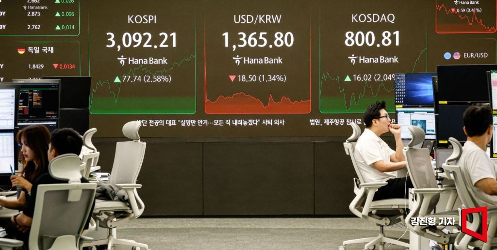 코스닥 지수가 약 11개월만에 800선을 돌파한 24일 서울 중구 하나은행 본점 딜링룸에서 딜러들이 업무를 보고 있다. 2025.6.24. 강진형 기자