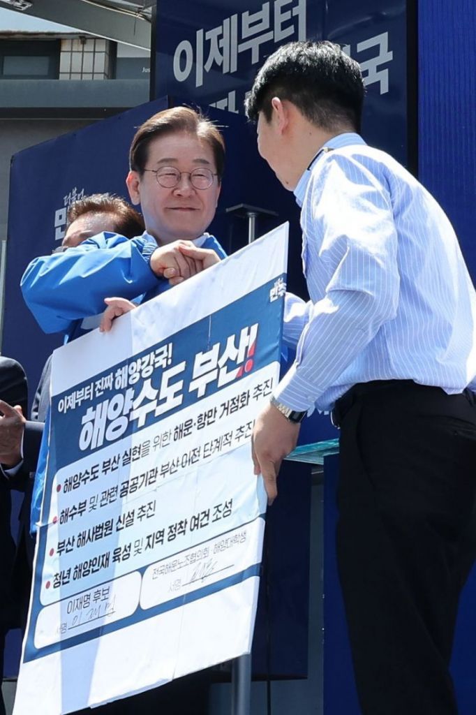 이재명 대통령이 이번 대선 당시인 지난달 14일 부산 부산진구 서면에서 권기흥 에이치라인해운해상직원노조 위원장과 해양수도 부산 협약서에 서명한 뒤 악수하고 있다. 연합뉴스
