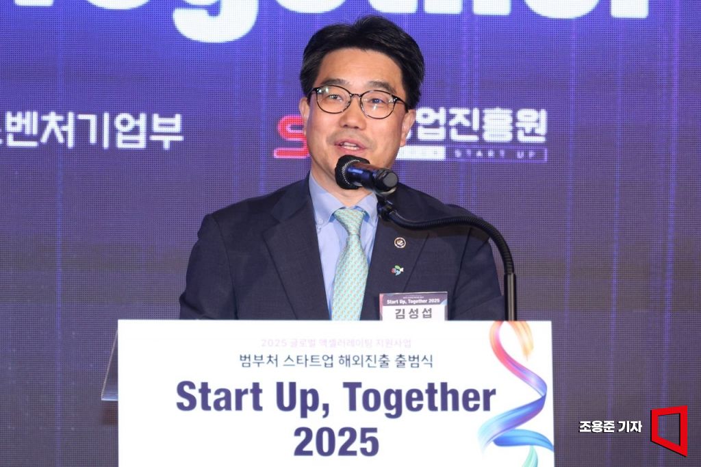 김성섭 중소벤처기업부 차관이 24일 서울 종로 포시즌스호텔에서 열린 범부처 스타트업 해외진출 출범식에 참석, 인사말을 하고 있다.