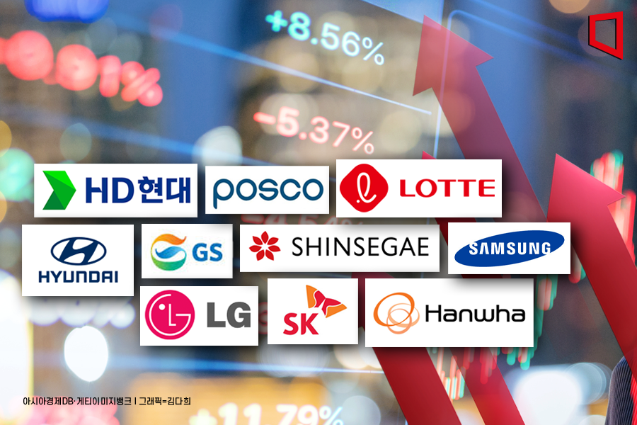 10대 그룹 중 8개 그룹의 시총이 두 자릿수가 넘는 증가율을 나타냈다. 그중 가장 큰 폭으로 시총이 증가한 곳은 한화그룹이었다. 한화그룹 시총은 지난해 말 42조6829억원에서 109조5795억원으로 156.73% 급증했다. 한화의 12개 상장 계열사 중 5개 종목의 주가가 올 들어 세 자릿수 증가율을 기록했다. 그중 한화(248.70%)와 한화에어로스페이스(218.41%)는 200% 넘게 올랐다. 이밖에 HD현대(48.53%), SK(38.30%), 신세계(31.72%), GS(20.65%), 현대자동차(19.73%), 롯데(13.30%), 삼성(11.32%), 포스코(5.19%) 순으로 시총이 늘었다.