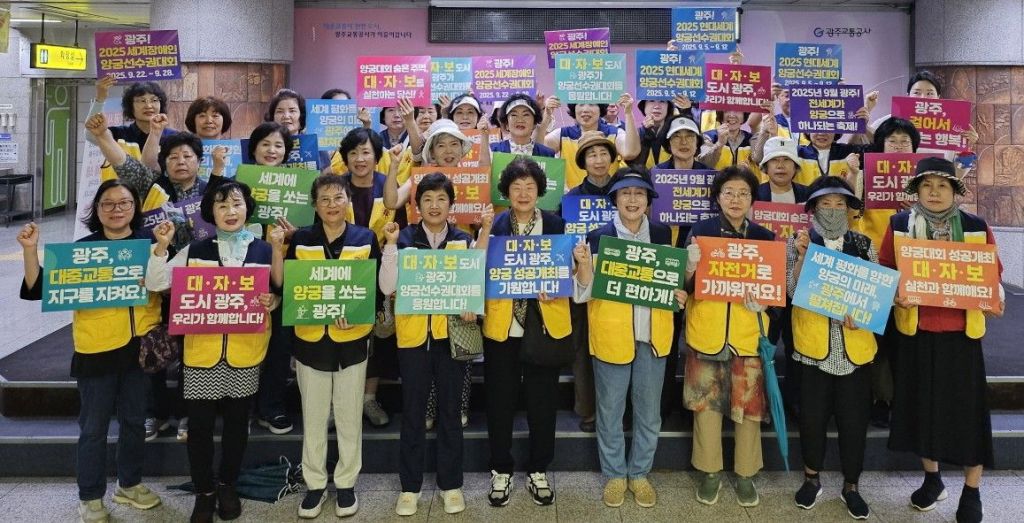 광주시자원봉사센터는 24일 서구 상무역 사거리 일원에서 '광주 2025 현대세계(장애인)양궁선수권대회'의 성공 개최를 기원하는 '대자보(대중교통·자전거·보행) 캠페인'을 전개했다.