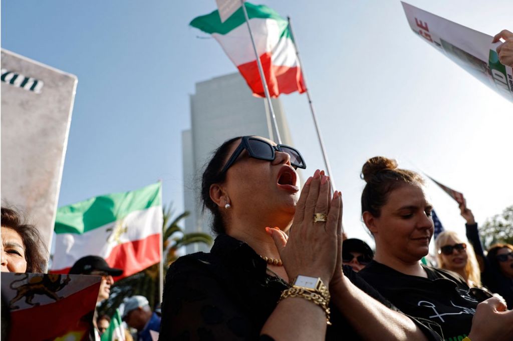 이란 정권교체 지지자들이 지난 23일(현지시각) 미국 로스엔젤레스에서 집회를 열고 있다. AFP 연합뉴스