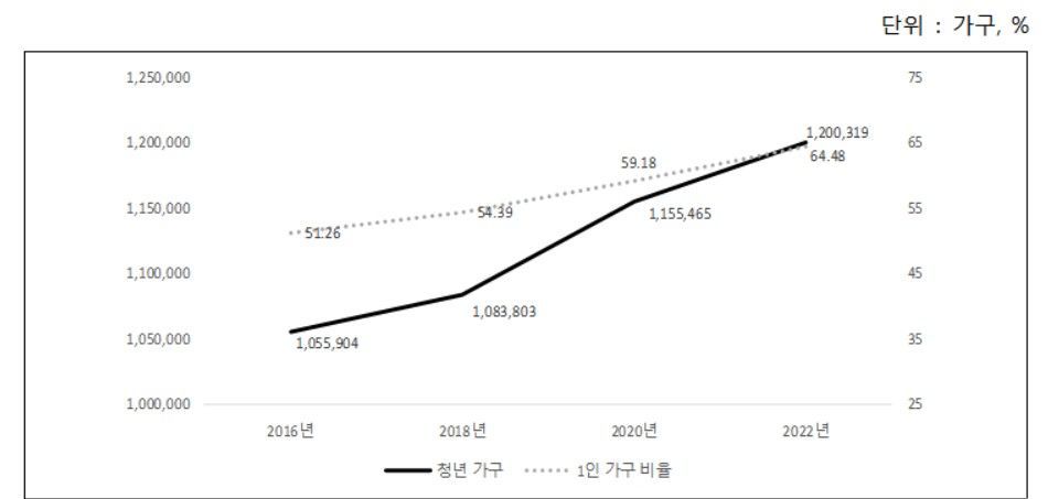 가구주가 만 19~39세인 '청년가구'는 2022년 120만가구로 2016년 대비 13.7% 증가했다. 서울 전체(409만가구)의 29.3%로, 청년 1인 가구 비율은 2016년 51.3%에서 2022년 64.5%로 늘었다. 청년 여성 1인 가구 비율은 70.6%로 청년 남성 1인 가구 비율(59.1%)보다 많았다.