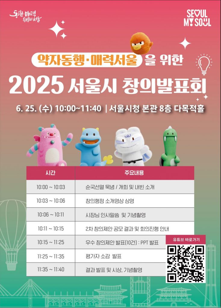 서울시는 25일 오전 10시 서울시청 다목적홀에서 시민·전문가 평가단, 공무원 등 300여명이 참석하는 '2025년 2차 창의발표회'를 개최한다. 창의발표회는 서울시장을 포함해 시의 모든 공무원이 새로운 시각으로 시민 불편을 발굴해 개선해나가는 창의행정 아이디어 공유의 장이다.