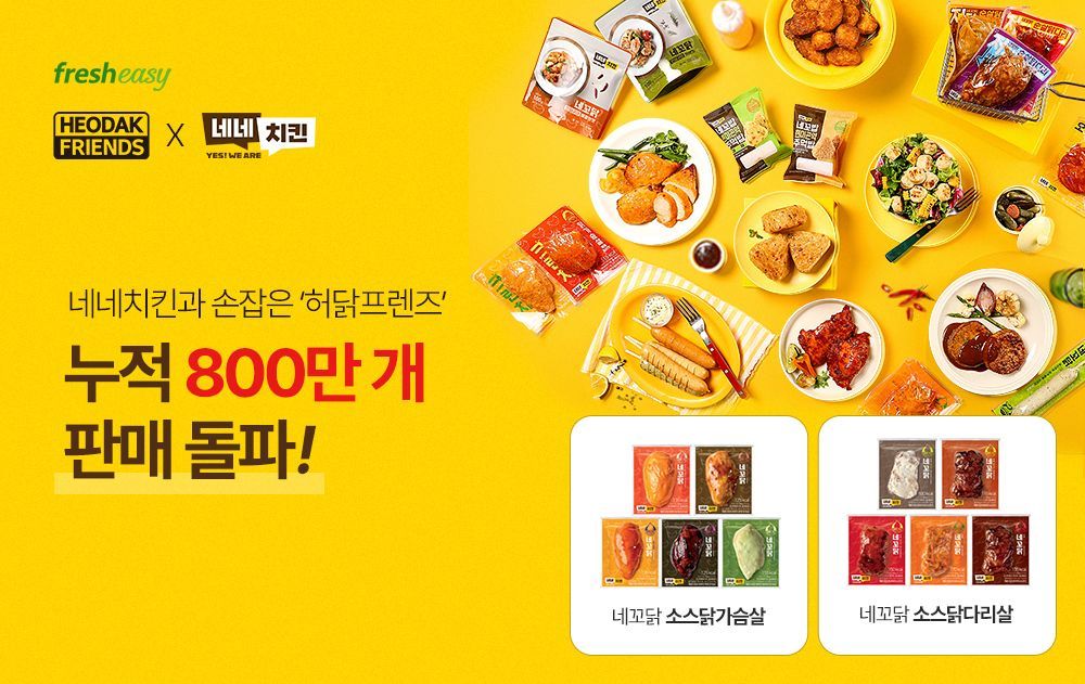 간편식 전문기업 프레시지의 자회사인 허닭프렌즈가 치킨 브랜드 '네네치킨'과 파트너십을 통해 개발한 간편식 제품의 누적 판매량이 800만개를 돌파했다고 25일 밝혔다.