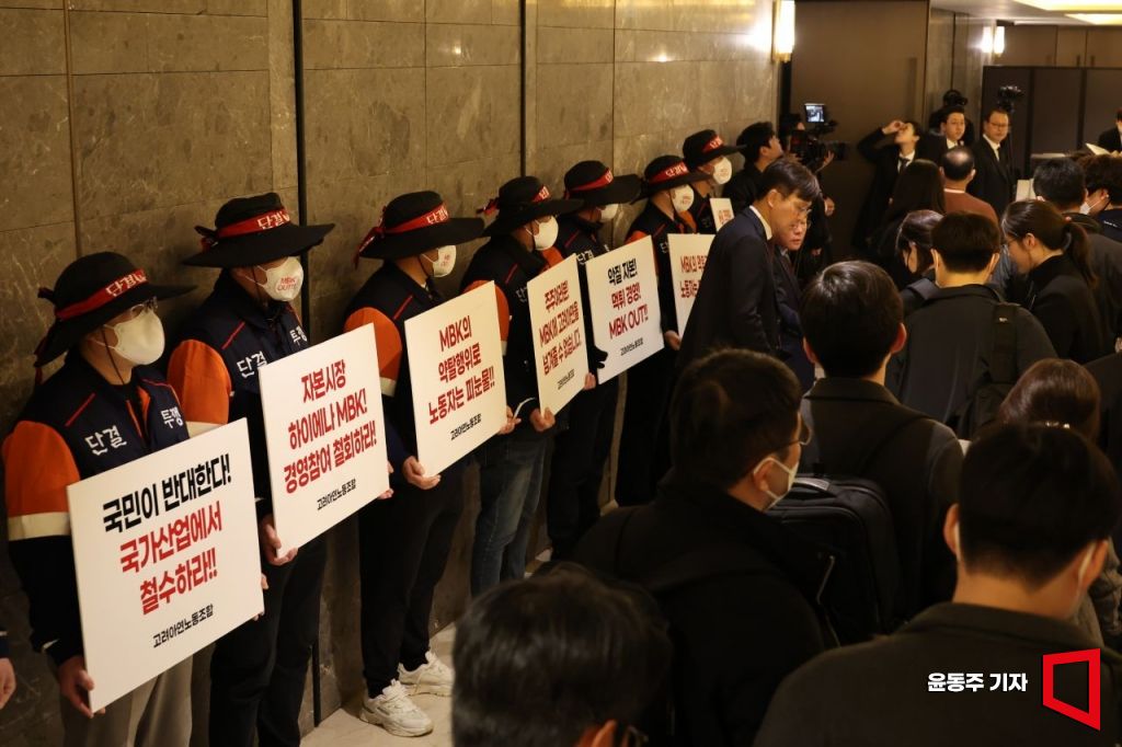 법원이 영풍·MBK파트너스가 고려아연을 상대로 '주주총회 의결권 행사를 허용해달라'며 제기한 가처분 신청을 기각했다. 28일 서울 용산구 몬드리안 호텔에서 열릴 예정인 고려아연 주주총회장 앞에서 고려아연 노조원들이 피켓팅 시위를 하고 있다. 2025.03.28 윤동주 기자