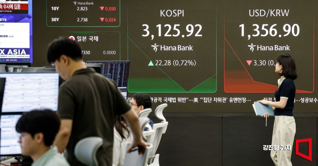 코스피 지수가 전 거래일 대비 24.15포인트 상승한 3127.79에 장을 시작한 25일 서울 중구 하나은행 딜링룸에서 딜러들이 업무를 보고 있다.