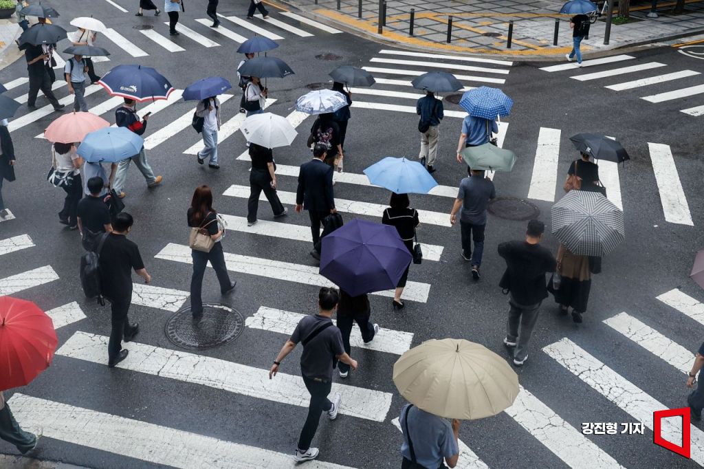 전국 대부분 지역에서 장맛비가 이어지고 있는 25일 서울 중구 서울시청 인근에서 직장인들이 우산을 쓰고 출근길에 오르고 있다.