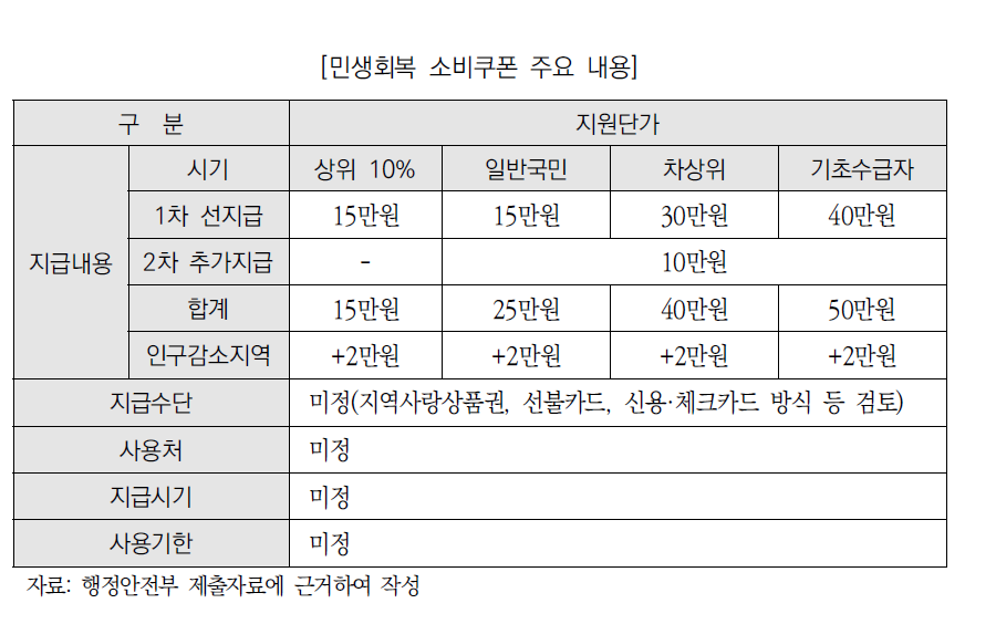 다만 세부적인 내용은 아직 정해지지 않은 부분이 많아 변수로 작용할 부분이 많다. 우선 사용기한을 정해야 하는데, 기간을 너무 짧게 잡을 경우 늦게 신청한 사람들의 사용 기한이 제한된다는 문제가 있다. 반대로 너무 길게 잡을 경우 경기진작 효과가 낮아지고 행정비용이 늘 수 있다.