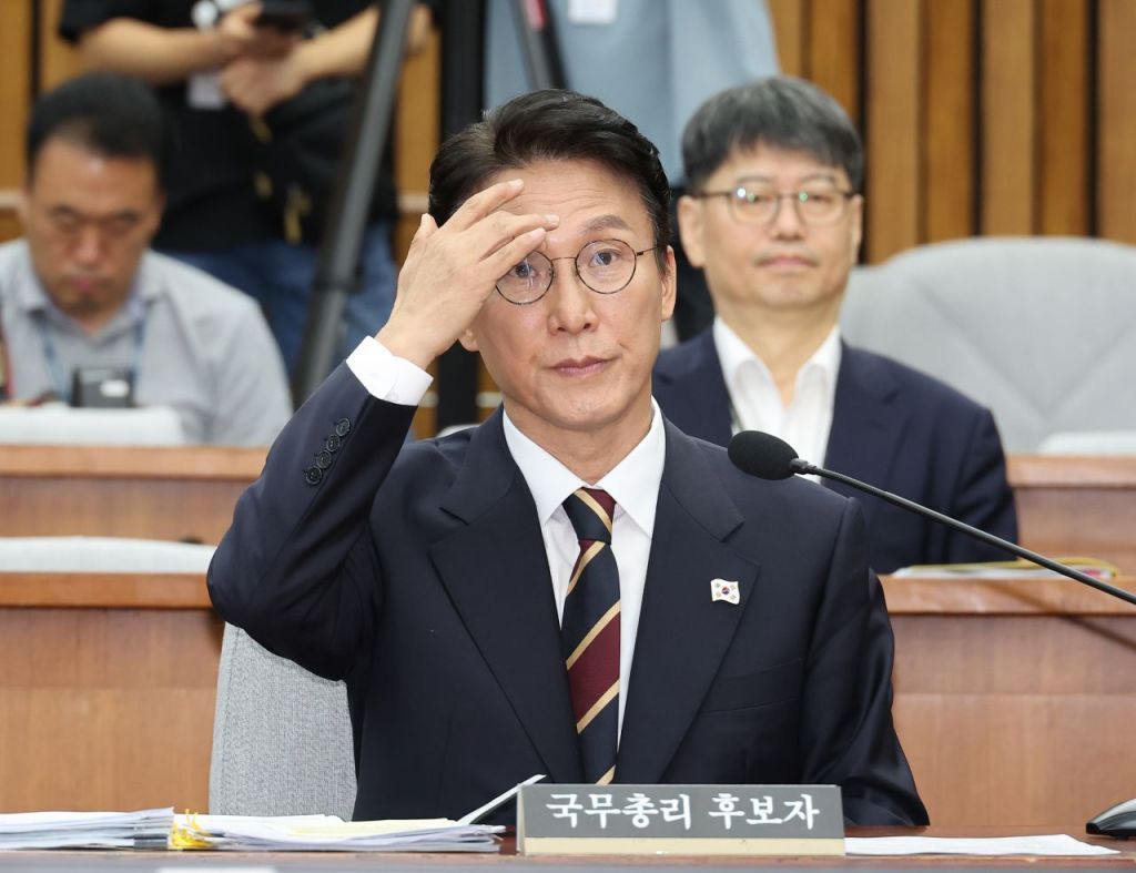김민석 국무총리 후보자가 25일 서울 여의도 국회에서 열린 인사청문회에 출석해 이마를 만지고 있다. 연합뉴스