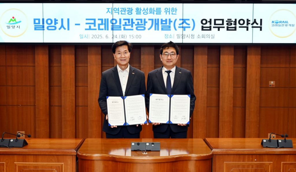 경남 밀양시는 시청 소회의실에서 코레일관광개발과 철도 연계를 통한 지역관광 활성화 업무협약(MOU)을 체결했다.