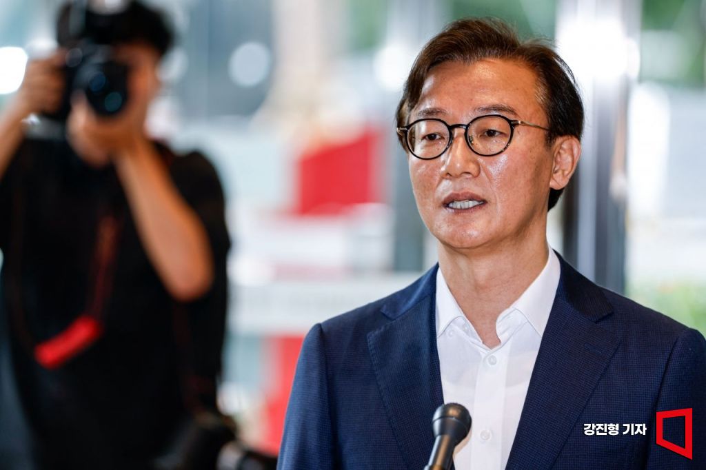 전재수 해양수산부 장관 후보자가 25일 서울 마포구 포스트타워에 마련된 인사청문 준비 사무실에 출근하며 취재진 질문에 답하고 있다.