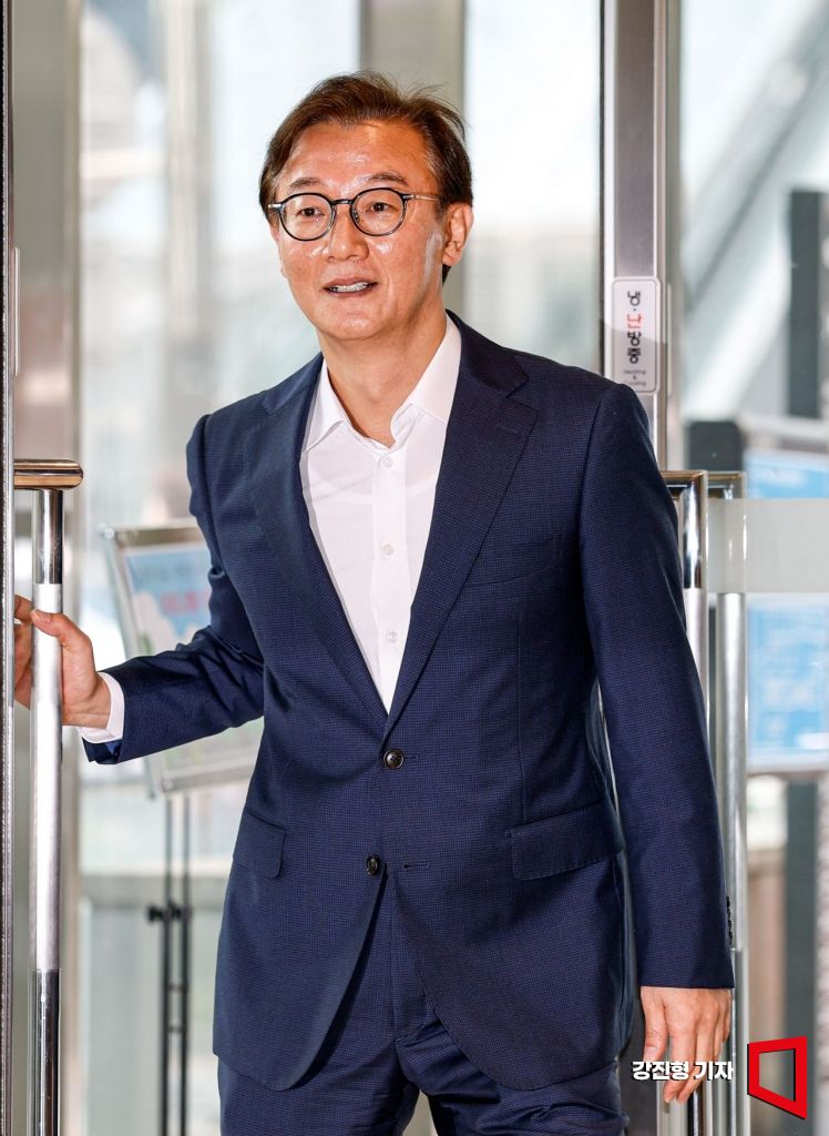 전재수 해양수산부 장관 후보자가 25일 서울 마포구 포스트타워에 마련된 인사청문 준비 사무실에 출근하고 있다.