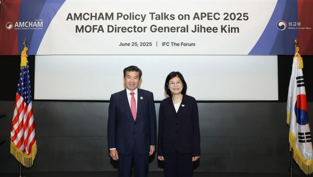 25일 오후 여의도 TWO IFC 더 포럼 브룩필드 홀에서 열린 'Policy Talks' 특별 세션에서 제임스 김 암참 회장 겸 대표이사와 김지희 외교부 국제경제국장이 사진촬영을 하고 있다. 사진=암참