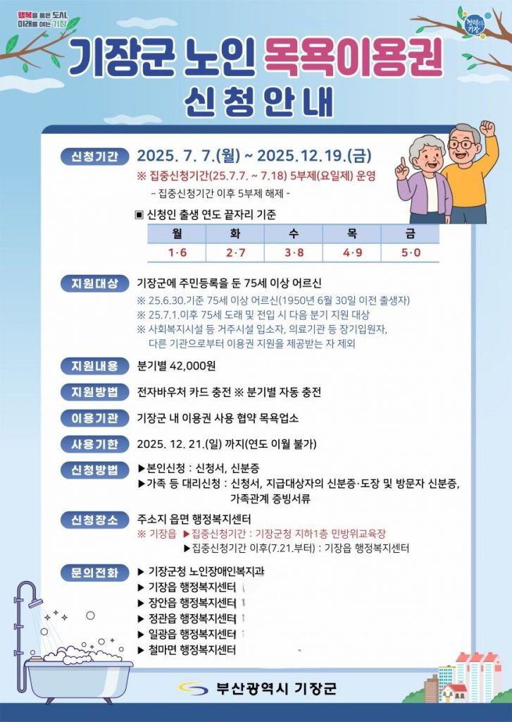 부산 기장군(군수 정종복)이 지역 어르신들의 위생·건강관리를 지원하기 위한 복지 정책으로 '어르신 목욕이용권 지원사업'을 7월부터 본격 시행한다.