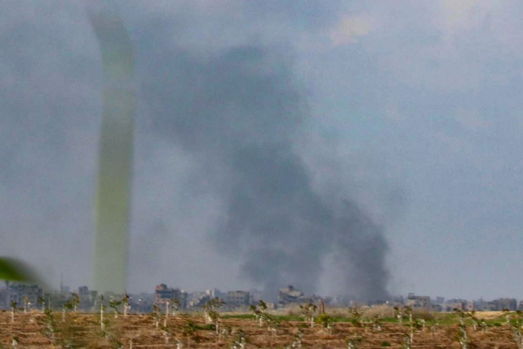 지난 1월 이스라엘 남부에서 바라본 장벽 너머 가자지구에 이스라엘군 포격으로 연기가 피어오르고 있다. 연합뉴스