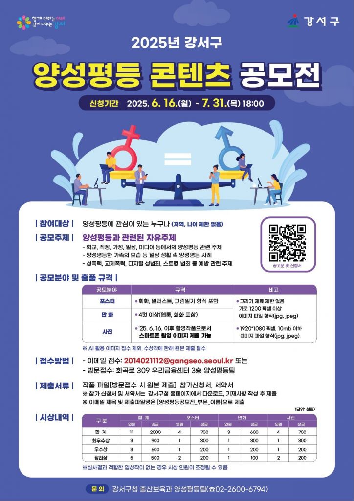 서울 강서구가 일상 속에서 성평등 문화를 확산하기 위해 ‘2025 양성평등 콘텐츠 공모전’을 개최한다.