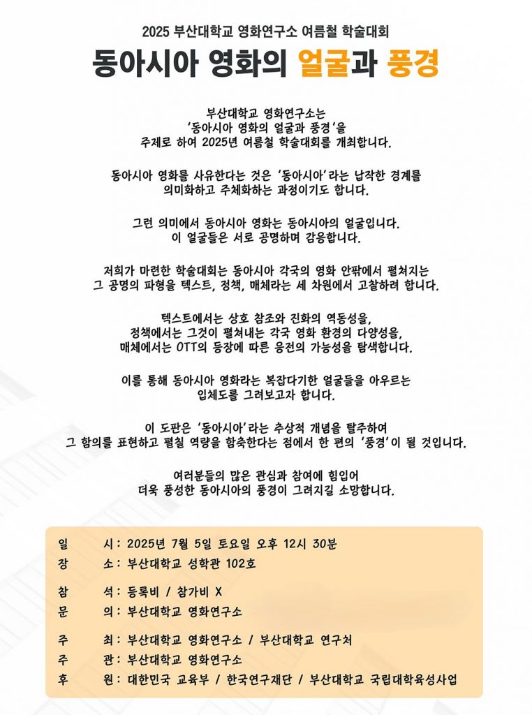 부산대학교(총장 최재원) 영화연구소는 오는 7월 5일 낮 12시 30분부터 교내 성학관 102호에서 '동아시아 영화의 얼굴과 풍경'을 주제로 '2025년 부산대 영화연구소 여름철 학술대회'를 개최한다.