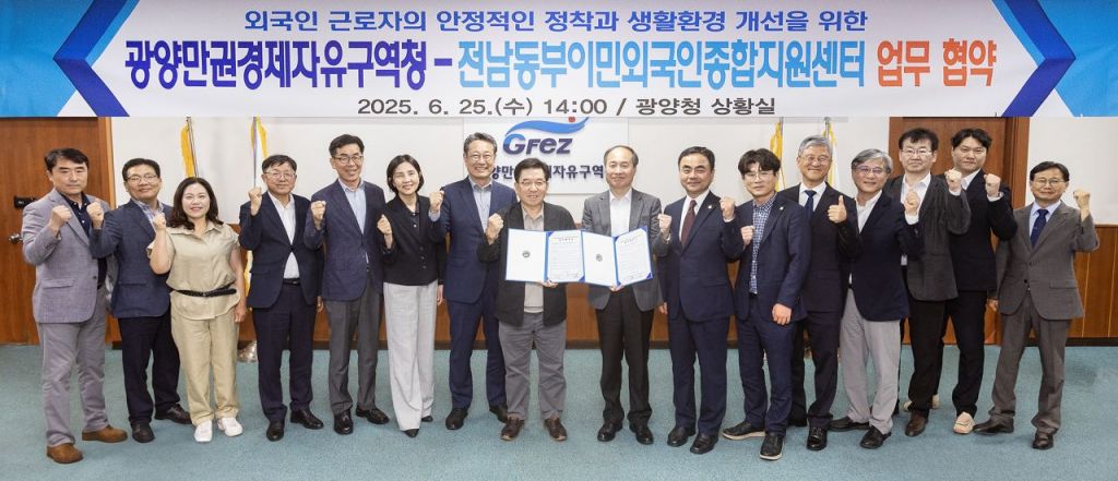 광양만권경제자유구역청(청장 구충곤, 이하 광양경자청)은 지난 25일 청사에서 전남동부이민외국인종합지원센터(센터장 조원일, 이하 지원센터)와 광양만권 내 외국인 근로자의 안정적인 정착과 지역사회 발전을 위한 업무협약을 체결했다고 26일 밝혔다.