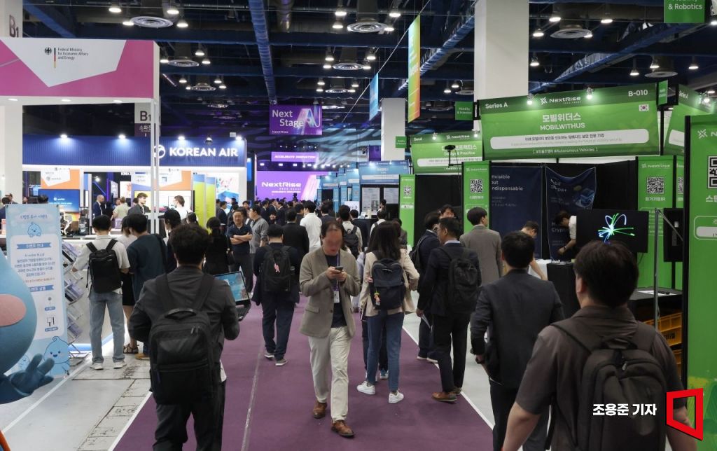 26일 서울 강남구 삼성동 코엑스에서 열린 '넥스트라이즈(NextRise) 2025 서울' 박람회를 찾은 관람객들이 참가업체 부스를 둘러보고 있다. 올해 7회를 맞은 국내 최대 규모 스타트업 행사인 넥스트라이즈는 국내외 스타트업 1천600여 곳과 대기업, 중견기업, 벤처캐피탈(VC) 250여 곳이 참가해 역대 최대 규모로 진행된다.