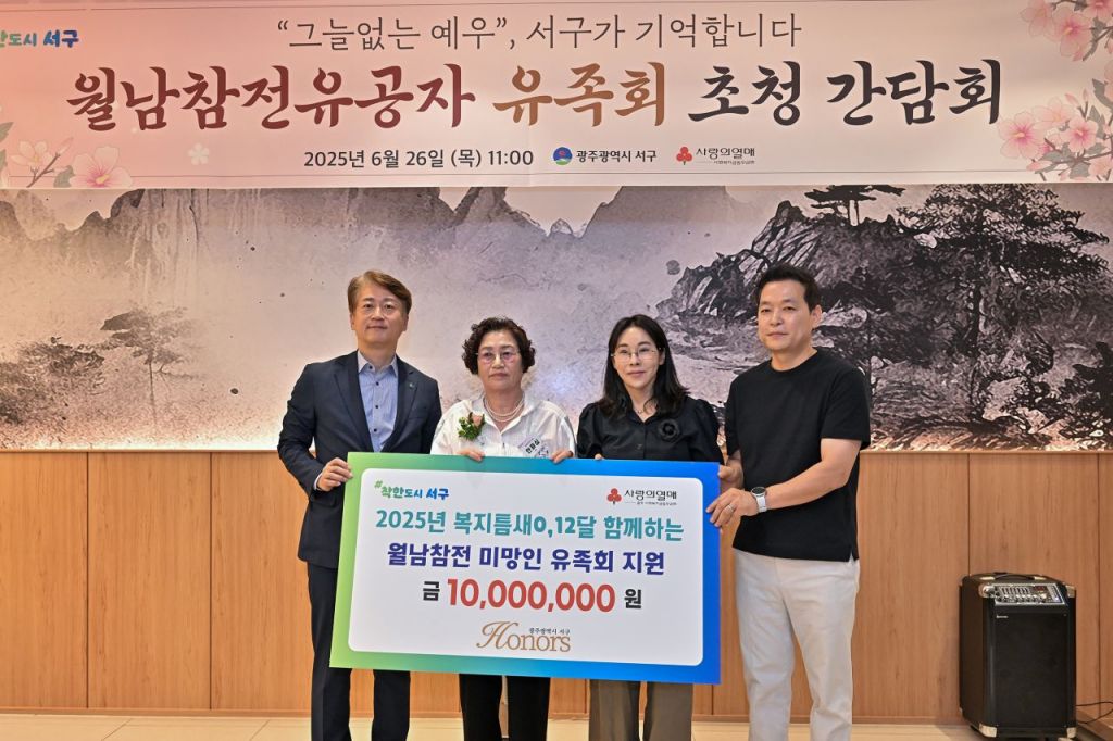김이강 광주 서구청장이 26일 서구 한 음식점에서 서구아너스 후원으로 열린 '월남참전유공자 유가족 초청 간담회'에서 아너스 후원금 전달식을 갖고 참석자들과 기념 촬영을 하고 있다. 광주 서구 제공