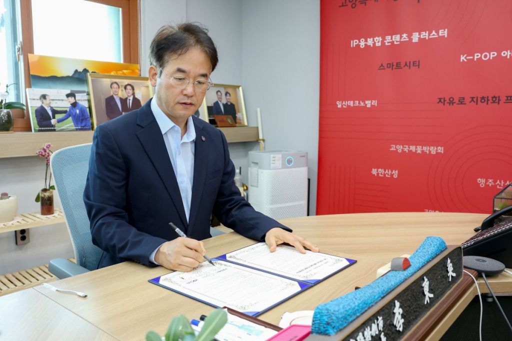 이동환 고양특례시장이 ‘드론·스마트시티 융합 실증 연구협력’ 협약서에 서명을 하고 있다. 고양특례시 제공