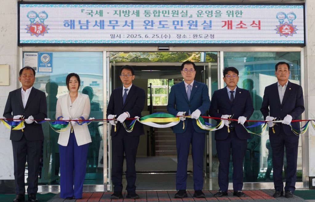 해남세무서 완도민원실이 지난 25일 완도군청 본관 3층에 둥지를 틀고 본격적인 업무에 돌입했다. 이날 개소식에는 광주국세청 한지웅 조사1국장과 박현주 해남세무서장, 신우철 해남군수, 김양훈 완도군의회 의장 등이 참석했다. 해남세무서 제공