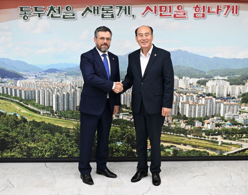 지난 25일 야니스 베르진스 주한 라트비아 대사가 동두천시를 공식 방문해 박형덕 동두천시장과 악수를 하고 있다. 동두천시 제공