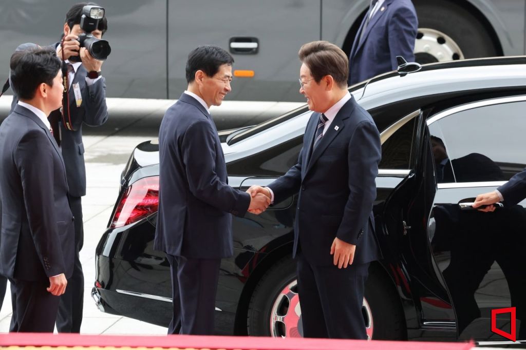 이재명 대통령이 26일 오전 서울 여의도 국회에서 추가경정예산안 시정연설을 위해 도착한 뒤 김민기 사무총장과 악수하고 있다. 국회사진기자단