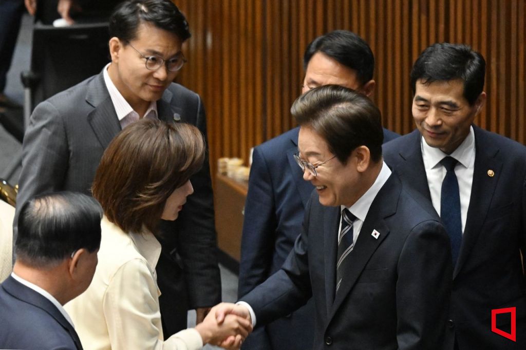 이재명 대통령이 26일 국회에서 열린 제426회국회(임시회) 제2차 본회의에서 2025년도 제2회 추가경정예산안에 대한 정부의 시정연설을 마친 뒤 나경원 국민의힘 의원과 인사하고 있다. 국회사진기자단
