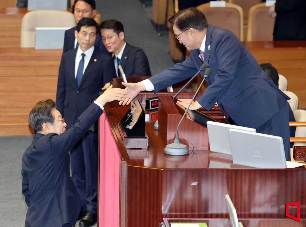 이재명 대통령이 26일 국회 본회의장에서 추가경정예산안에 대한 시정연설을 마친 후 우원식 국회의장과 악수하고 있다. 국회사진기자단